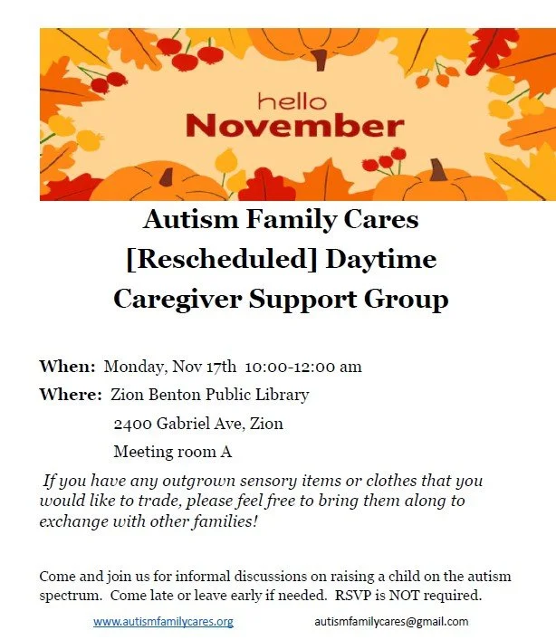 Autism Family Cares was founded by a few parents who wanted an opportunity to talk candidly with other parents going through similar challenges and victories. Our ongoing Family Support Groups are informal discussions about caring for a child on the autism spectrum. We usually meet once a month in Lake County, IL. Please come as you are, arrive late, or leave early. We attempt to alternate daytime and evening meetings each month.